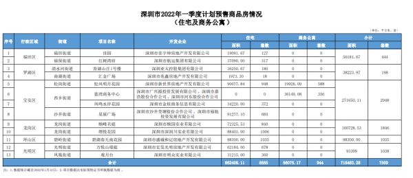 时间:2022-01-13 18:20中国网地产讯 1月13日,从深圳市住房和建设局获悉,截至2022年1月12日,深圳市2022年一季度计划入市的商品住宅及商务公寓项目13个,预计供应房源面积为71.85万平方米,7509套,其中:住宅66.24万平方米,6565套;商务公寓5.61万平方米,944套。