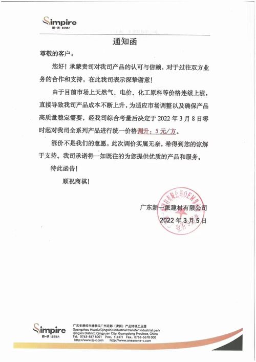 近日,全圣企业旗下肇庆市伟达陶瓷发布大规格岩板产品价格涨价的通知显示,3月10日起对9mm厚的800×2600、900×1800、900×2000mm规格在原开单的基础上提升6元、3元、5元不等,而此次产品升价的对象是OEM合作客户。广东新一派建材也在3月5日发布通知函,决定于3月8日零时起对公司全系列产品进行统一价格调升5元/方。