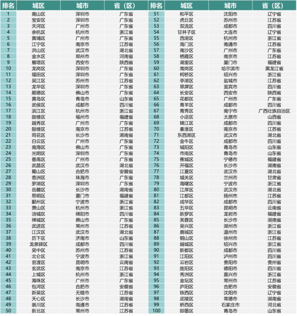 具体来看,广东前十占半数,其中,深圳南山区、深圳宝安区以及广州天河区包揽创新百强区前三名,此外浙江、江苏、湖北、河南、陕西各有一区上榜前十,分别是杭州余杭区、南京江宁区、武汉洪山区、郑州金水区以及西安雁塔区。