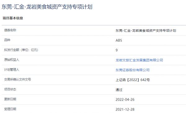 中国网地产讯 4月27日,据上交所披露,东莞-汇金-龙岩美食城资产支持专项计划已获上交所通过。