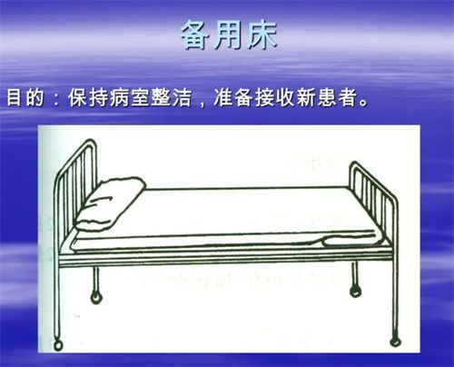 先要确保病室里面的整洁性,让新入院病人可以使用。除了备用床用物以外,还需要备橡胶单,按照备用床操作方法就可以。接下来要将备用床盖被四折在床尾,再来根据病情需求来,上缘距离床头大概是在45到50cm,床缘的下垂可以把床垫塞入。