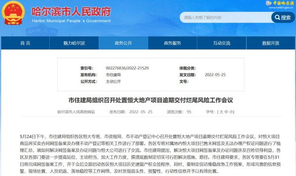 中新经纬5月25日电 据哈尔滨市人民政府网站25日消息,哈尔滨市住建局组织召开处置恒大地产项目逾期交付烂尾风险工作会议。