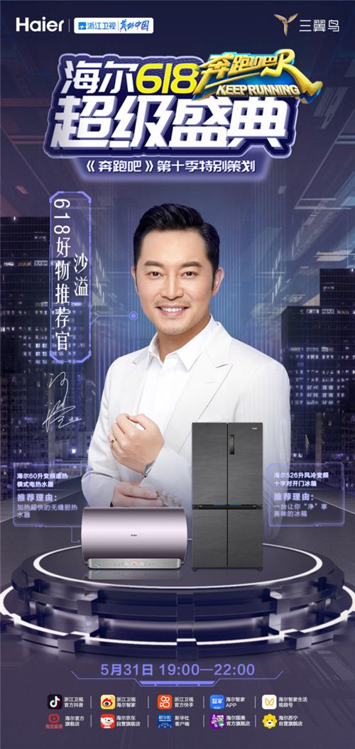 5月31日晚19:00,海尔智家将携手沙溢、金靖、马伯骞、伍嘉成等大咖,打造全国首档IP主题沉浸式带货直播盛典。现场不仅有跑男团闯关挑战,还将发布4个必购清单。这个618,不光是《奔跑吧》兄弟团为科技而战,海尔智家更为用户健康生活而跑。