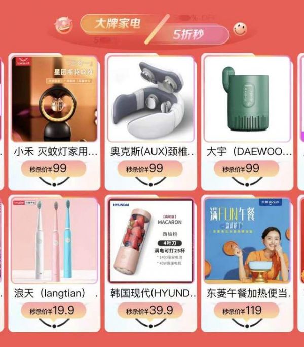在“好货真5折”版块,大牌家电5折秒活动正在火热进行中,持续给消费者带来低价惊喜。浪天充电式全身水洗电动牙刷低至19.9元;韩国现代小型便携式电动榨汁机只要39.9元;大宇负离子灭蚊灯仅需99元。更有破壁机、手持吸尘器、水龙头净水器等品质家电任意选!