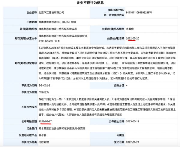 中华网财经6月28日讯:据海南省住房和城乡建设厅近日发布的处罚(处理)决定文号“陵水黎族自治县住房和城乡建设局党组会议纪要〔2022〕16号”显示,北京华江建设有限公司在工程名称“海南陵水香水湾B区(B-05)地块”中存在管理方面的不良行为,陵水黎族自治县住房和城乡建设局对其进行处罚。处罚日期显示为2022年5月20日。