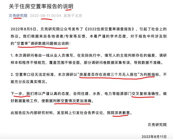 中华网财经8月11日讯:今日凌晨,贝壳研究院通过其官方公众号发布《关于住房空置率报告的说明》称,2022年8月5日,贝壳研究院公众号发布了《2022住房空置率调查报告》,引起了社会上的热议。我们根据来自各地读者/专家等反馈,本着严谨的学术态度,对于报告中所涉及到的“空置率”调研数据问题做出说明: