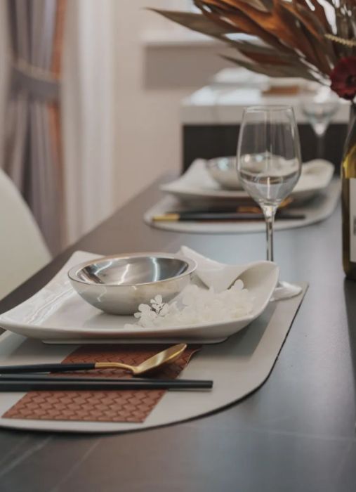 餐厅空间内,设计师放置了一款岩板材质的餐桌,深色调的样式让餐厅更具格调,旁边搭配了四把白色布质餐椅,丰富了餐厅的颜色层次,在自然光的照耀下,那种独特的闲适感觉显得那么与众不同。
