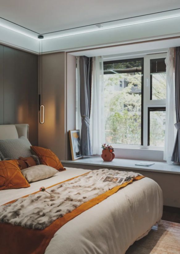 卧室部分我追求的是踏实与舒适。主卧部分的墙板沿用了客厅的风格,空间内放置了一款与其颜色相近的卧床,两侧造型独特的吊顶尽显温馨。因为我很喜欢周末静静地看着窗外想事情,所以设计师在主卧、次卧都进行了飘窗的设计,满足了我这个小小的需求。