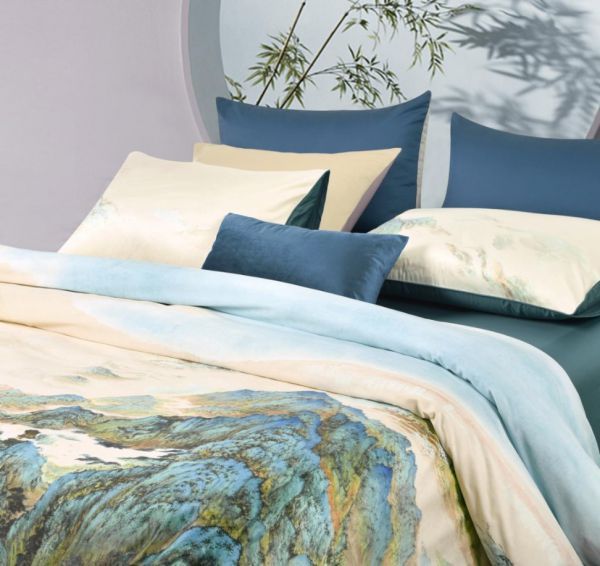 由于《福山赋》本身是一件由19位书画家共同完成的巨大画作,实景细节又特别丰富,色彩繁复,如何合理选取元素应用到床品上,并且元素排布既不能破坏画面的美感,又能体现出画作原本蕴含的美学素养,这对设计师是一个较大的考验。