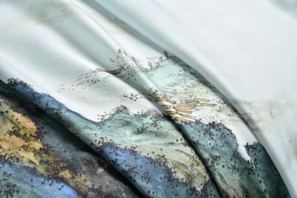 高静丽介绍:“在面料选材方面,我们也是进行了多次谨慎的考量,从全棉贡缎、亚麻到真丝材质,最终确定了两款再生纤维,凉感滑爽的天丝和温润优雅的天鹅绒。这两种面料不仅契合绿色发展理念,同时材质呈现的色调更加柔和亮丽,能够更好地展现绿水青山的优美,并且一薄一厚两种触感能为消费者提供春夏秋冬全时段的健康呵护。”