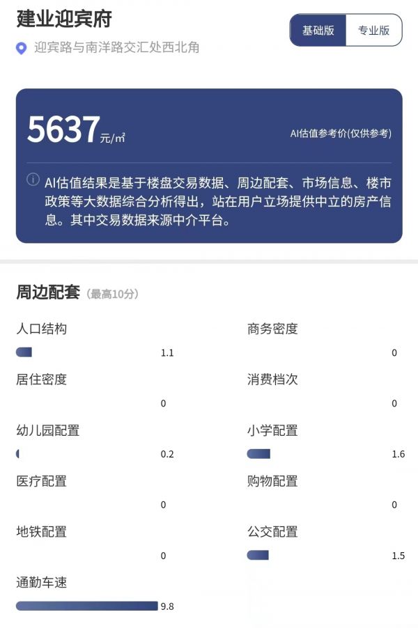 据每经品房小程序测评,建业迎宾府项目周边配套除通勤车速得分最高达9.8分外,其他配置的得分均不高。其周边1公里主要道路早晚高峰平均车速为35.08公里/小时,优于所在区域98%的住宅项目,相对属于驾车出行舒适度高的区域。