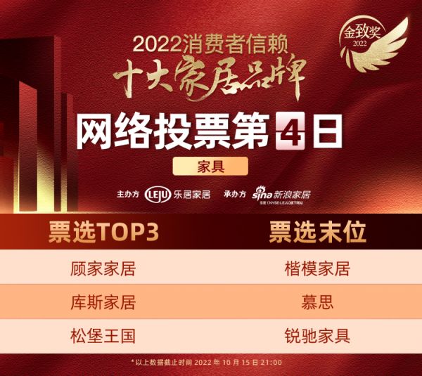 由乐居家居主办,新浪家居承办,CCTV《大国品牌》、家页、家居质量研究院、大国中居联合主办,全国工商联家具装饰业商会、中国建筑材料流通协会共同指导,乐腾商学院、家页智库、家居质量研究院提供研究支持的“2022消费者信赖十大家居品牌”于9月16日正式启动。经过企业申报、候选品牌公示环节后,该活动于10月12日正式进入投票环节。>>点击为家具类行业品牌投票