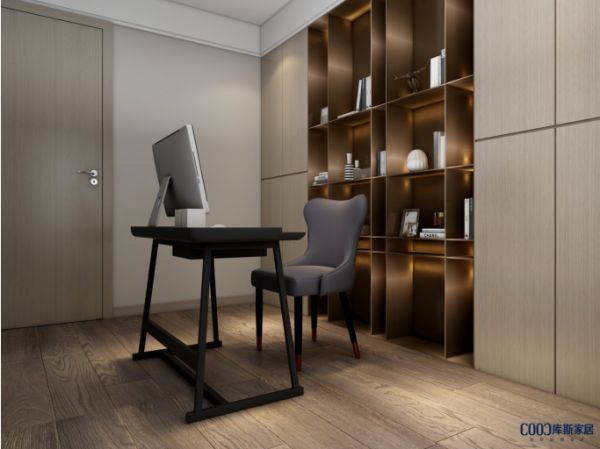 书房延续着主卧的设计风格,极简的书桌配上木色的背景墙以及香槟金的内嵌书架,商务感十足。