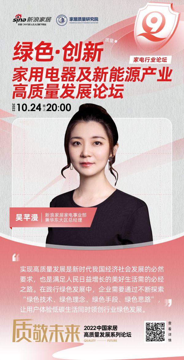 脚踏三大绿色赛道,创新推动高质量发展。2022年10月24日晚上20:00,由新浪家居家电事业部策划的“绿色·创新·高质量 家用电器及新能源产业发展新动力”线上论坛圆满召开。