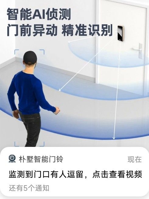 当来访者按下门铃时,用户手机会同步收到通知,通过APP与来访者可视通话,可实时了解情况。用户在上班或者外出时,也可以通过手机app随时查看门前动态,搭配400w超清像素摄像头和大广角视野,让门前情况尽在掌握。