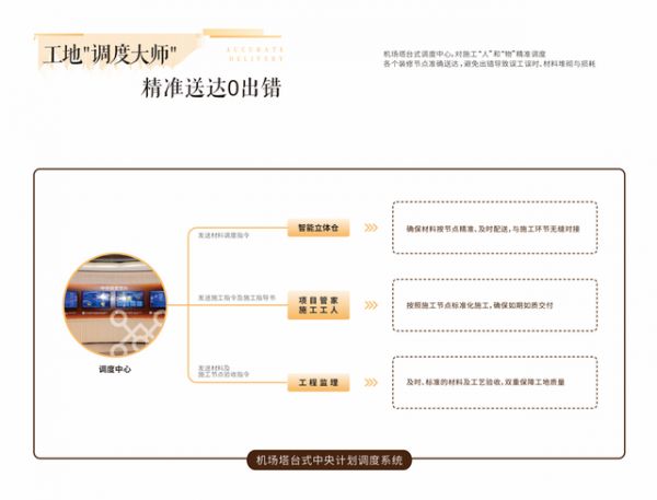 试装还可以精准核算施工总量,科学规划施工排期和用时,系统自动按施工节点智能生成施工指令和作业指导书,再通过机场塔台式调度中心对“人”和“物”的精准调度,确保材料准确无误送达业主家里,5G数字工地指导施工,避免了出错导致误工误时。