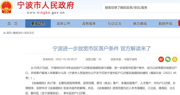10月27日,《宁波市区户口迁移实施细则》正式施行,新政进一步放宽市区的落户条件,在居住(就业)落户方面实行“70年产权房即可落户”,取消原先“缴纳社保”的要求;租赁落户则是从城镇地区同一街道(镇)的成套住宅连续租住登记和社保缴纳均满2年放宽至均满1年。