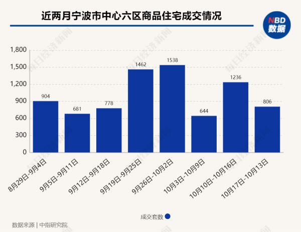中指研究院数据显示,10月3日~23日三周时间,宁波市中心六区共成交商品住宅2686套,成交均价为20305.33元/平方米。