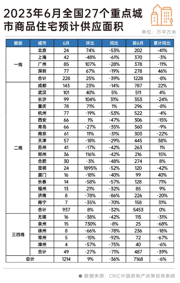 CRIC调研数据显示,6月全国27个重点城市商品住宅新增供应面积预计为1214万平方米,环比增长9%,同比下跌36%,较前6月的月平均供应量仅微增1.6%。
