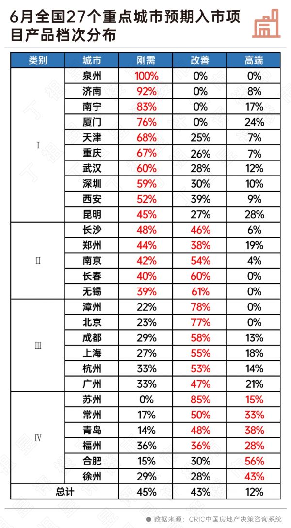 从新增供应的产品看,刚需、改善产品平分秋色,供货占比分别为45%、43%,高端产品占比13%。其中,泉州、济南等城市的纯刚需产品是6月新增供应的绝对主力,长沙、郑州等城市的新增供应中,刚需、刚改产品供应同步发力,也正好适应当地偏刚性的需求结构。