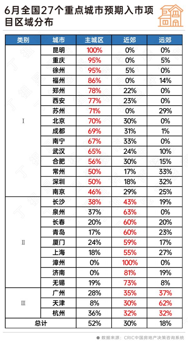 北京、上海等城市新增供应不济将拖累成交。北京和上海的新房市场不缺需求也不乏购买力,供应是影响成交的最主要因素。6月份北京和上海预计入市的项目质量不差,主城加近郊占比都在七成以上,但受限于较低的供给规模,成交也难有强势增长表现。