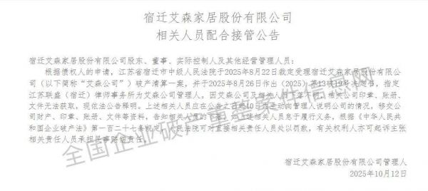 10月12日,宿迁艾森家居股份有限公司管理人发布公告,宣告这家成立于2016年的家居制造企业正式进入破产清算程序。根据公告,江苏省宿迁市中级人民法院已于2025年8月22日裁定受理该公司的破产清算案,并由法院指定管理人全面接管。