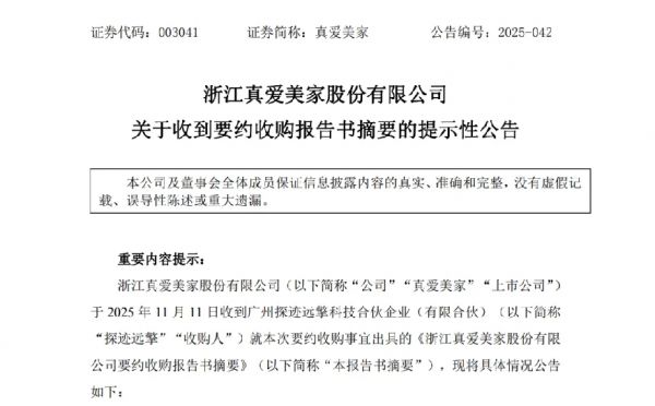浙江真爱美家股份有限公司(证券代码:003041,证券简称:真爱美家)于11月11日晚间发布公告称,公司收到来自广州探迹远擎科技合伙企业(有限合伙)发出的《要约收购报告书摘要》,标志着一起涉及近18亿元的股权收购与部分要约收购正式启动。