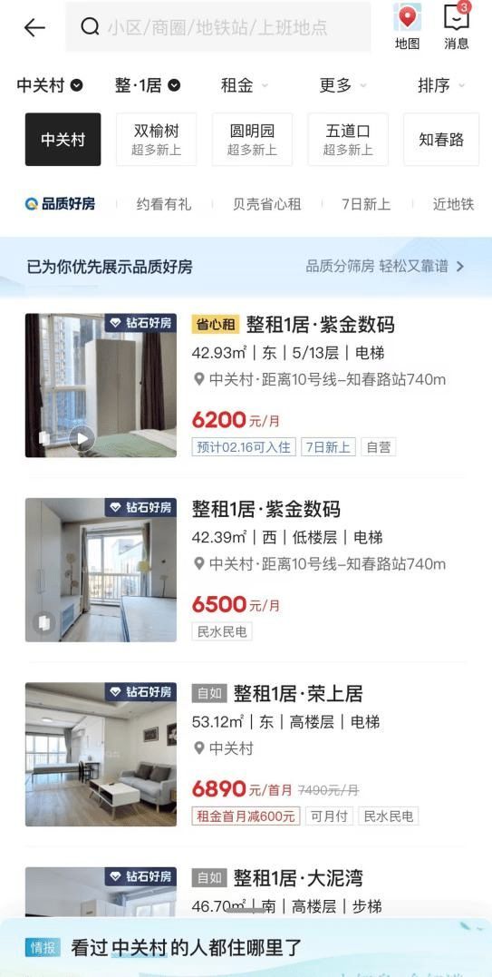在贝壳找房APP租房页面搜索北京中关村区域,不同类型的钻石房源被优先展示