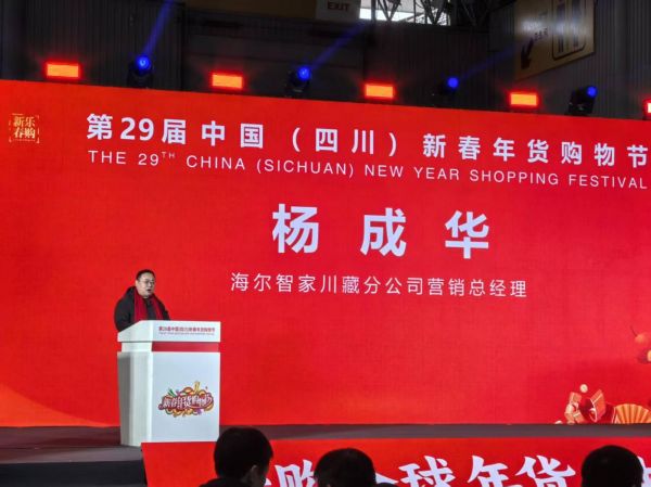 年货节启动会上,海尔智家川藏大区营销总经理杨成华先生上台发表了致辞,传递了2.1日海尔天悦套系在年货节上上市发布的消息以及为广大的四川消费者准备的海尔、卡萨帝产品和年货节专属礼遇。同时,表示海尔将继续以行业领军者的姿态,与四川市场同发展,与四川人民共美好。
