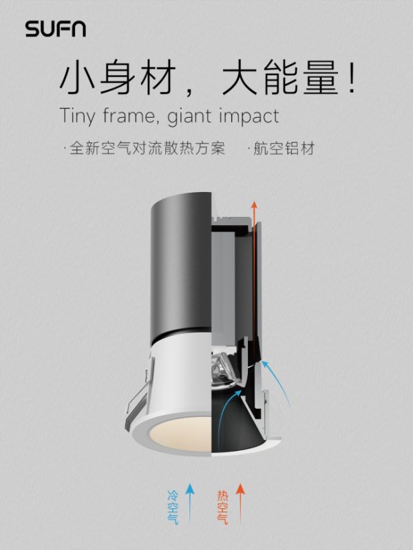 锐志锐典系列,则主打“小开孔,大能量”的显著特点。据了解,该系列应用了基于空气动力学原理的散热结构设计,旨在提升散热效率,从而在缩小开孔尺寸、尽可能维持天花完整性的同时,保障灯具的高光效与长期运行的稳定性,以适应市场对极简视觉风格的普遍追求。