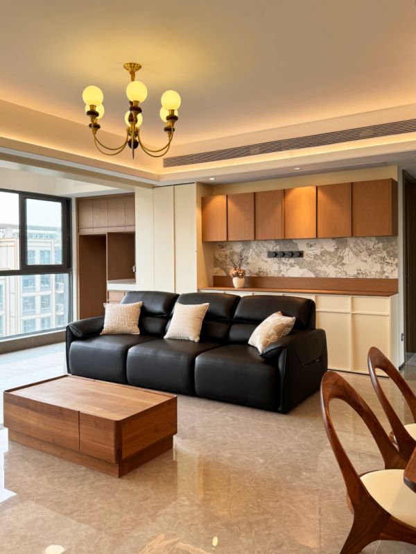 沙发后方定制了整墙餐边柜,堪称客厅的视觉焦点与收纳核心。