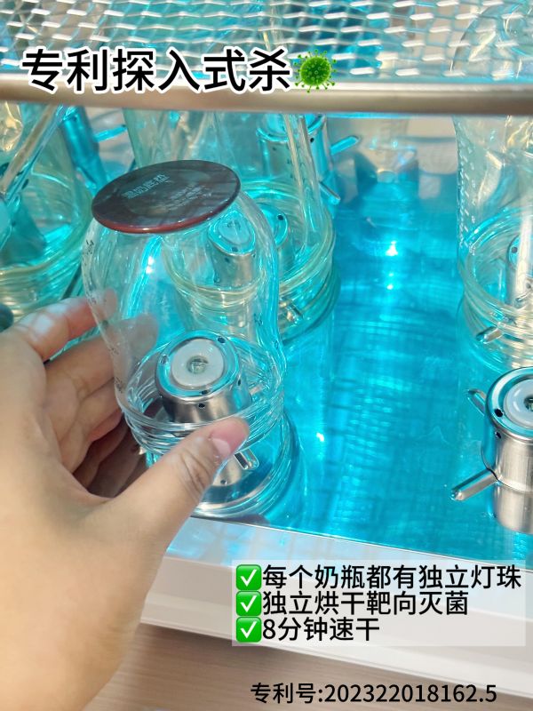 作为消毒柜,消毒烘干效果当然是大家最关心的。这款的独家探入式消毒烘干专利(实用新型专利 专利号:202322018162.5),能实现靶向直射杀菌。这意味着我家宝宝一天8次的奶瓶,它一台就能轻松搞定,开机六七分钟就能摸到奶瓶明显干爽起来。