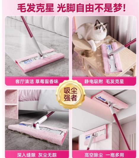 优点:免手洗即用即抛,静电吸附力是普通拖把的 3 倍,珍珠纹 / 三重立体集尘拖布能牢牢锁住毛发灰尘,清洁时不扬灰,长杆设计拖地不用弯腰,360° 旋转可深入家具底部,小粉款自带草莓香,适配宠物家庭清洁;缺点:以干拖为主,应对重度油污需搭配专用湿巾,清洁重度污渍的效率稍低;适合:养宠家庭(掉毛多)、鼻炎患者,日常干拖吸灰、清理毛发,想要轻松省力清洁的人群;不适合:作为厨房重度油污、卫生间大量水渍的主力清洁工具。