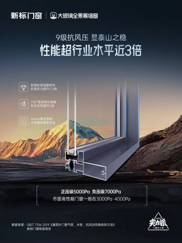 新标大玻璃全景幕墙窗以建筑幕墙级标准强化窗体结构,搭载新标独创专利技术斗拱榫钢卯窗体结构(专利号ZL202421685085.7),将幕墙局部使用的龙骨插芯款贯穿整个门窗主框,整框抗风压性能提升300%。运用90°钢卯幕墙拼框结构,让窗框拼接更严密、型材更坚固抗变形,大幅提升高层建筑及大玻璃门窗的承重抗压能力,真正实现建筑幕墙级的稳固可靠,直面雷暴大风与冰雹冲击依旧安然无恙。