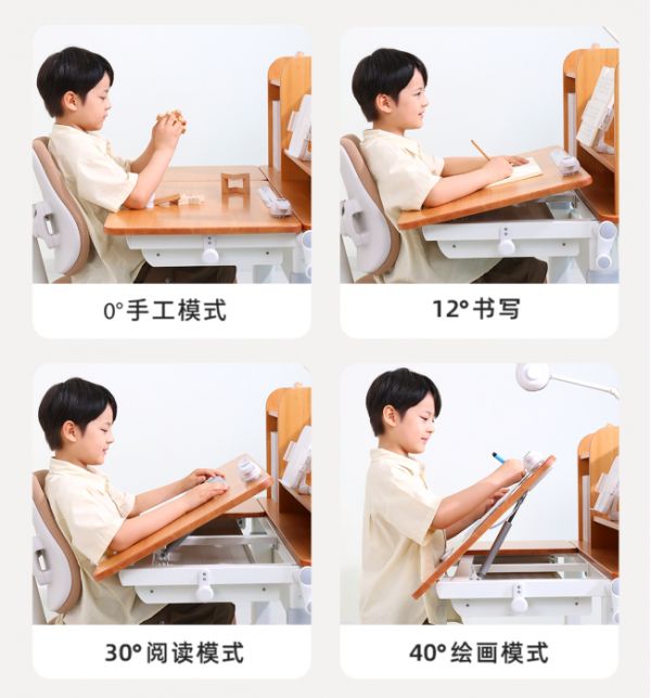 光明园迪学习桌搭载创新小 C 口弧形专利设计,桌面延伸 7cm,搭配同步追背正姿椅,实现肘部自然承托、腰背均匀受力,从根源防趴桌,让孩子坐下即呈舒展挺拔姿态。桌面支持 0-40° 调节,配备专利角度指示器,针对书写、阅读、绘画场景分别设定 12°、30°、40° 黄金视角,防低头,守护儿童视力健康。