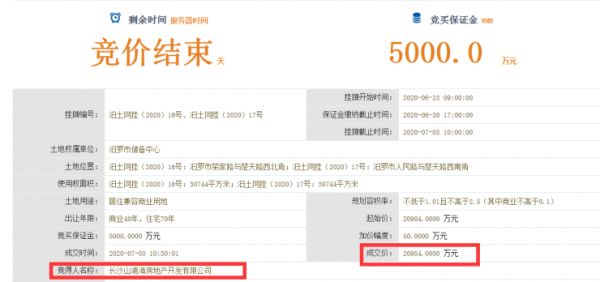 今日,汨罗市有一宗居住兼容商业用地开拍,汨土网挂(2020)16号、汨土网挂(2020)17号,该地块最终被长沙山湖海房地产开发有限公司以20954万元摘得。