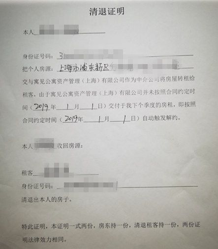 陈先生回忆称,2018年11月底,房子的房东找上门,称寓见公寓的业务员给他的最后一笔房租到10月份截止,往后再也无打款,让房东与租客自行解决。经过协商,最终陈先生在派出所民警指导下,与房东签订了清退证明(见下图),与寓见公寓的合同作废。