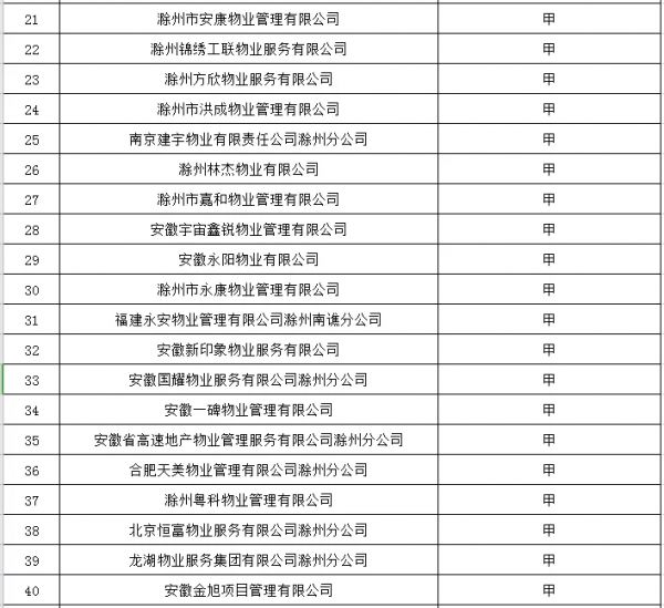 根据《滁州市物业服务企业信用档案管理实施细则》的有关规定,经各区物业主管部门评定上报、市住建局统一汇总(详见附件),现将2019年度滁州市城区物业服务企业信用等级评定结果予以公示。公示期内,如有异议,可向市住建局物业科和各区物业主管部门反映核实,接受业主和社会监督。