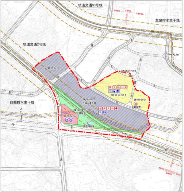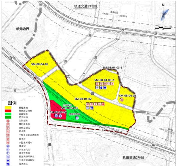 在设施规划方面,SM-08-04地块在行政办公设施方面规划社区服务站2处;文化设施方面规划文化活动站2处;教育设施方面规划幼儿园2所;体育设施方面规划小型多功能运动场地1处;医疗卫生设施方面规划卫生服务站1处;社会福利设施方面规划托老所1处;道路交通设施方面规划机动停车场1处;其他设施方面规划生鲜超市2处;环境设施方面规划再生资源回收点2处,公共厕所2处,生活垃圾收集站1处。