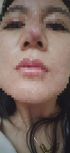记者注意到,蔡女士鼻尖的部位有非常明显的塌陷,且鼻梁处发红严重。
