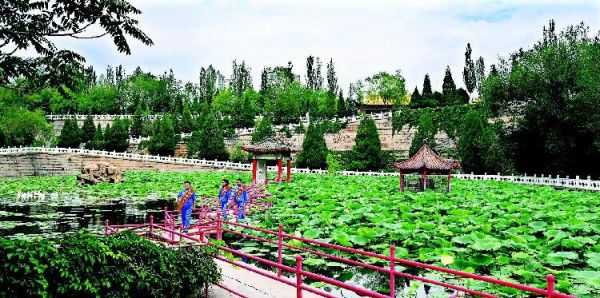 8月15日,几名青年志愿者在太钢渣山公园荷塘边巡检现场环境。自太钢实行公众开放日活动以来,作为“爱国主义教育基地”的太钢渣山公园吸引了大批社会团体、各界人士参观访问,从1990年至今,累计接待国内外参观者60万人次。