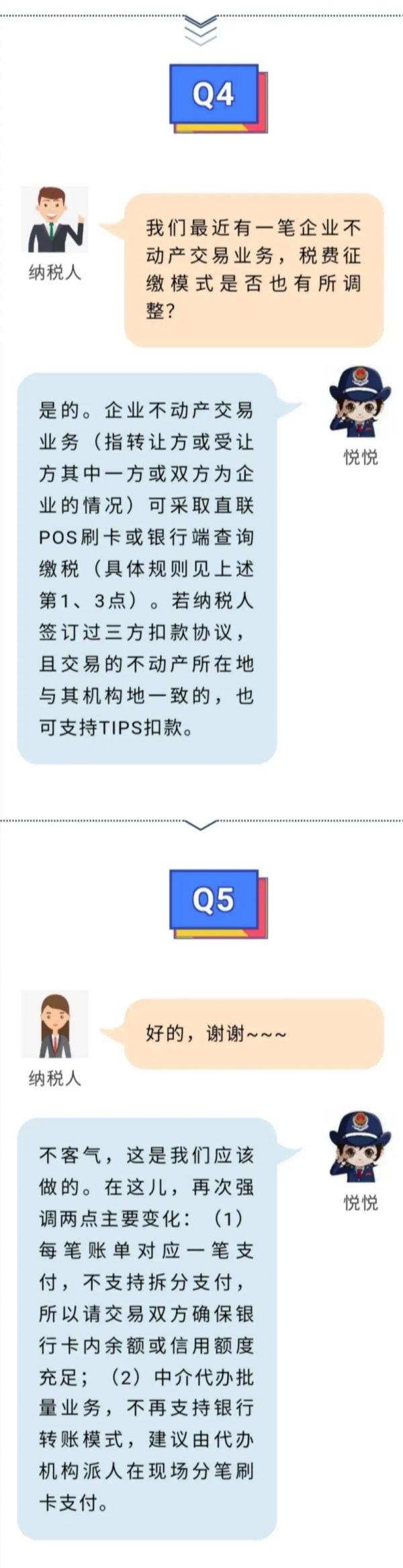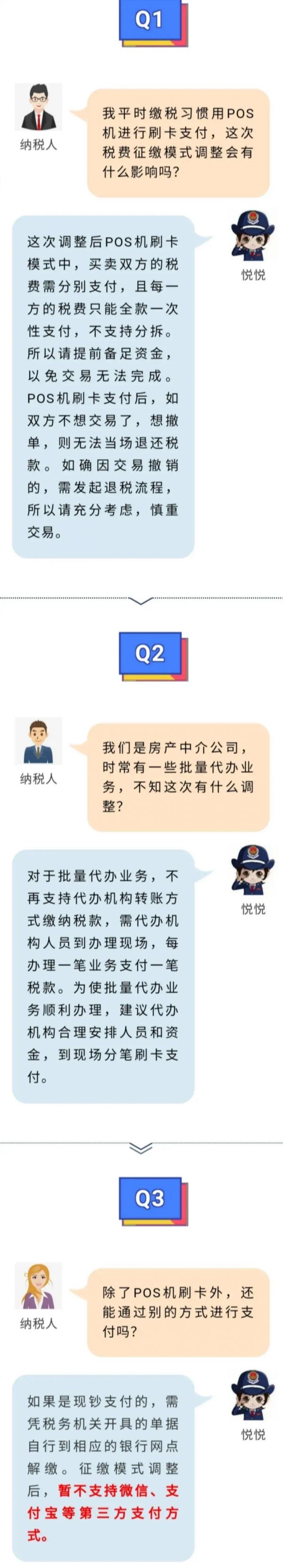 第三,对于批量代办业务——主要是房产中介机构批量代办,不再支持代办机构转账方式缴纳税款,需代办机构人员到办理现场,每办理一笔业务支付一笔税款。