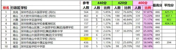 近日,深圳市各大中学相继公布了中考的“成绩单”。据统计,2020年中考成绩的深圳地区学校共108所,其中,考生平均分超过400分的共四所:百合外国语学校、北大附中南山分校、亚迪学校、何明德实验学校香蜜湖校区;420分以上比例超过40%的共三所:百合外国语学校、亚迪学校、北大附中南山分校。