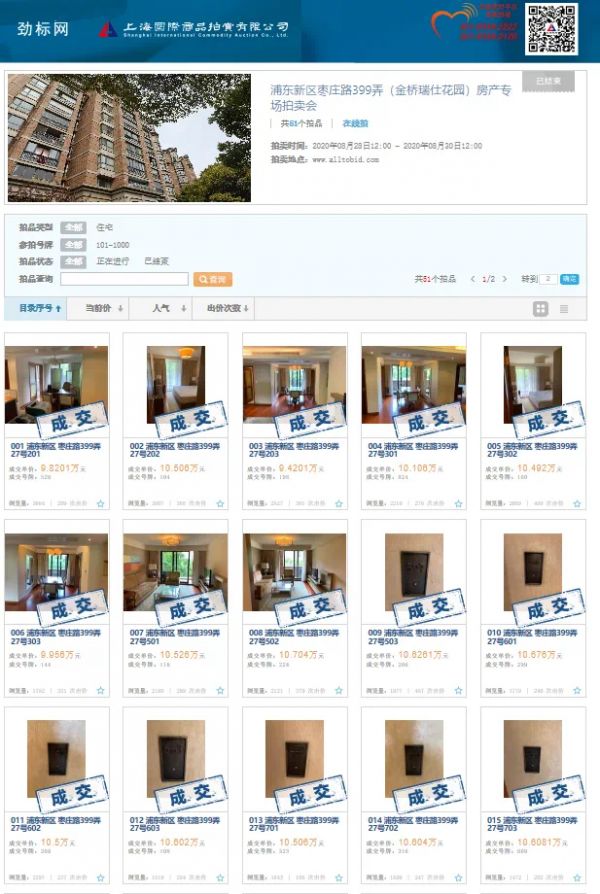位于上海浦东新区枣庄路399弄27号的金桥瑞仕花园51套住宅拍卖当日截拍,全部溢价成交。本次拍卖会在开拍后1小时,所有拍品就全部有人出价,可见热度之高。本场拍卖会浏览次数达8万人次,刷新了上海国拍单场拍卖会浏览量纪录。