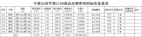 8月31日,阜阳市发展和改革委员会网站公布了中梁山河甲第S15#商品房销售明码标价备案表,共计6套商铺,备案均价21151元/㎡,总备案面积755.38㎡。