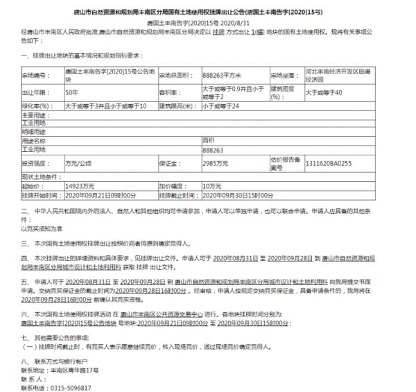 唐山市自然资源和规划局丰南区分局国有土地使用权挂牌出让公告