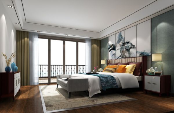 蓝色背景壁画似惊鸿一瞥中映入眼际的轻灵和雅致,如蝴蝶轻扑,落梅飘然,红色实木家具带来地厚重感被一驱而散。