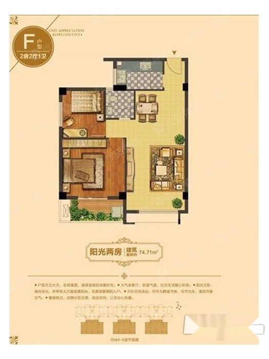 目前主打户型建面约2室2厅1卫-74.7㎡