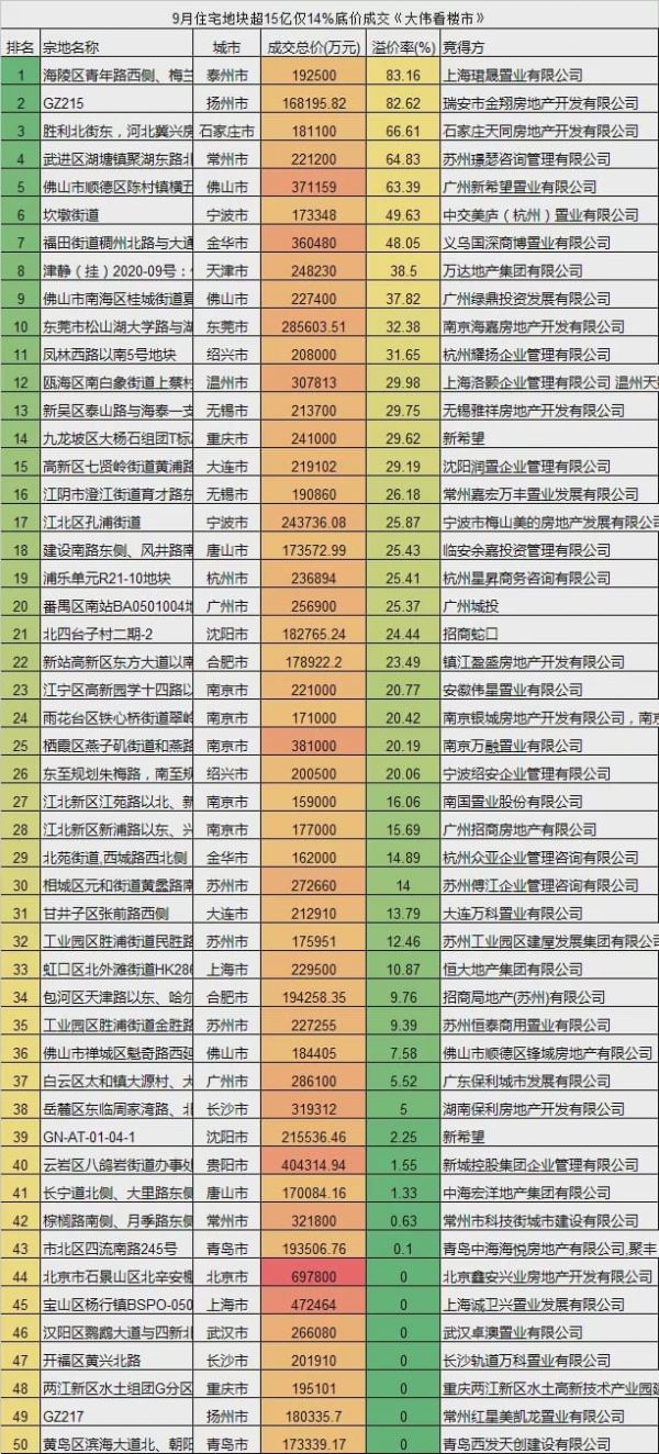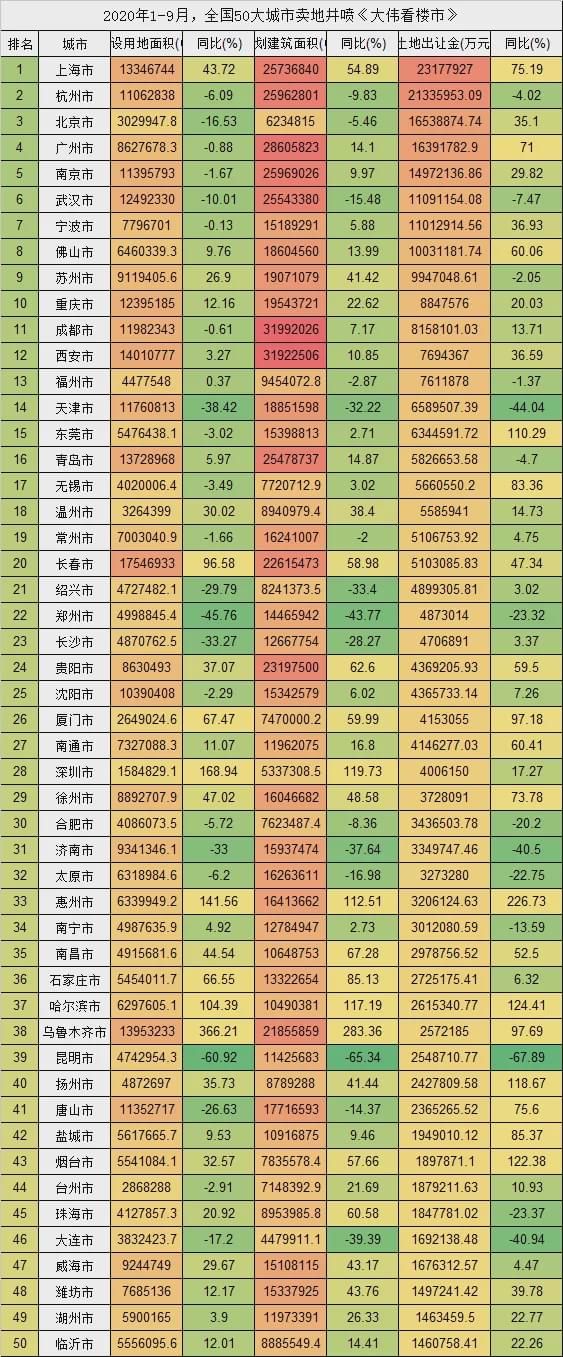整体看,疫情影响逐渐过去,多城市集中井喷卖地,土地市场成交额持续上升,截至9月底50大城市年内卖地超过2.96万亿,同比2019年同期上涨幅度高达17%。
