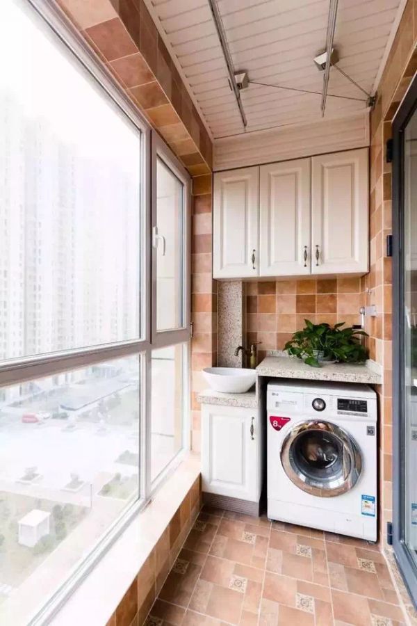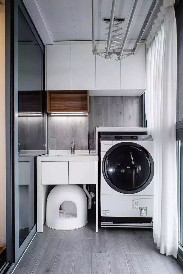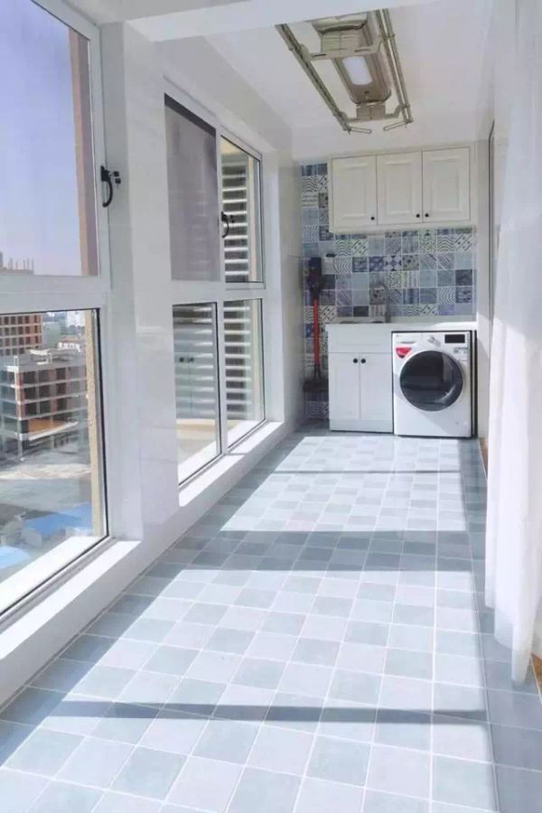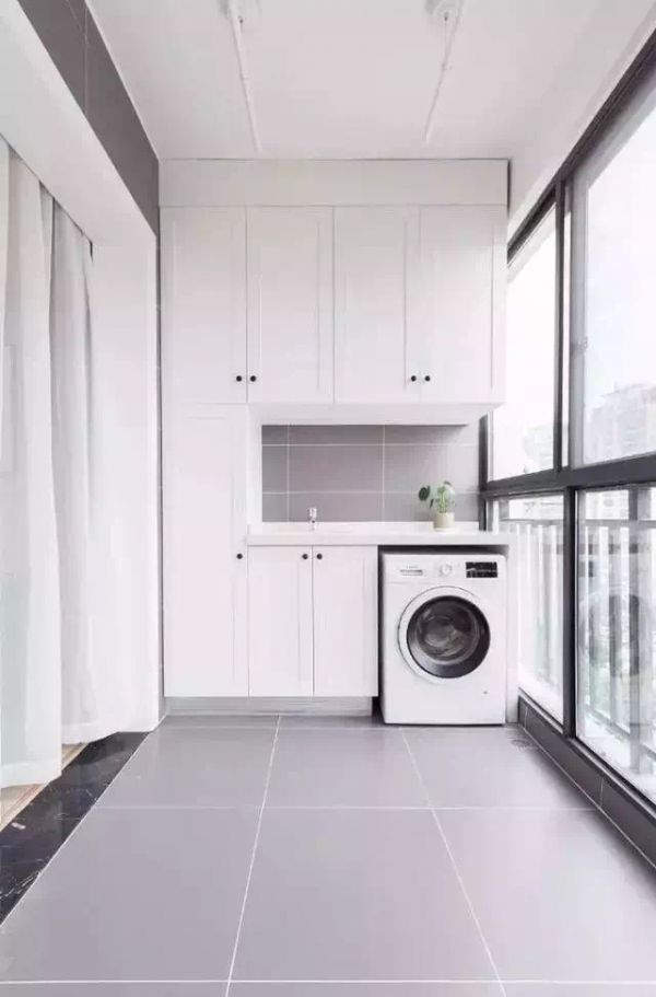 近几年灰色系的设计也是非常流行的,把阳台的墙地面铺上灰色的哑光砖,搭配白色的柜子、黑色的门槛石、玻璃框架,也非常好看。